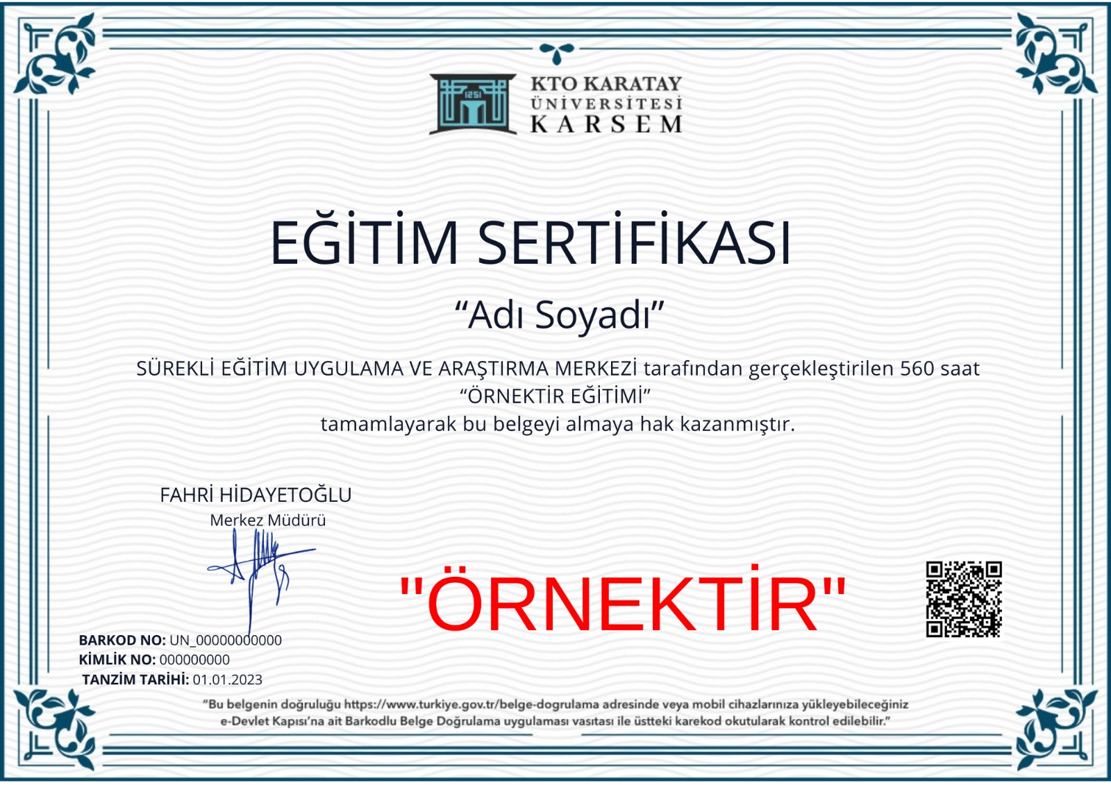 KTO KARATAY ÜNİVERSİTESİ SÜREKLİ EĞİTİM MERKEZİ MÜDÜRLÜĞÜ TARAFINDAN ONAYLANAN VE E-DEVLETTE SORGULANIP GÖRÜNTÜLENEN SERTİFİKALAR